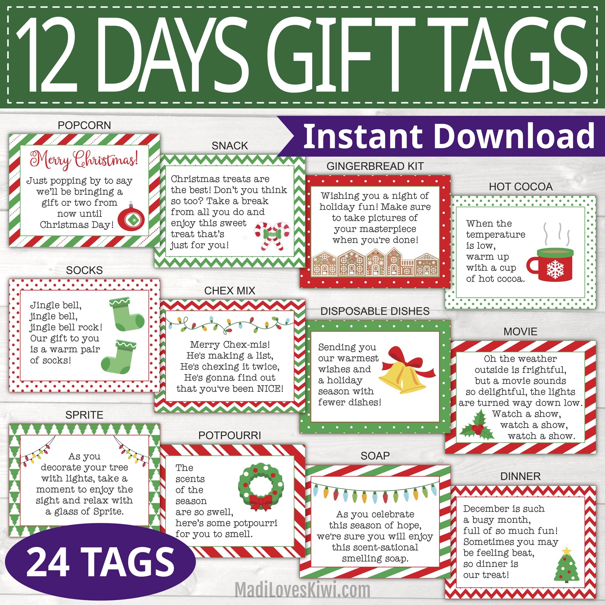 Printable 12 Days Of Christmas Gift Tags Instant Download Secret Santa Card Xmas Presents Madi Loves Kiwi Digital Downloads