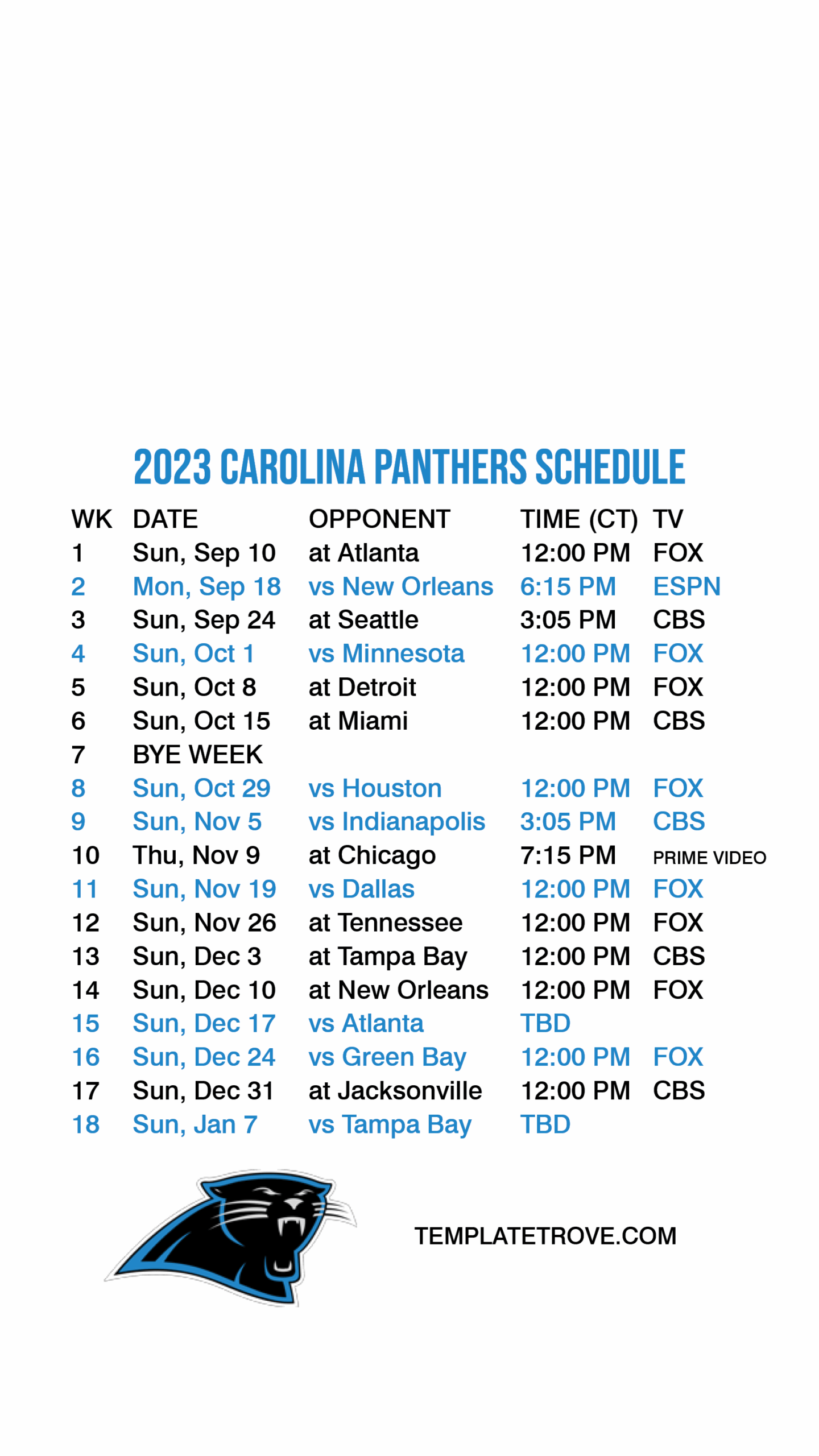 Print out your Carolina Panthers Schedule 2025 today and mark your calendars for those can’t-miss games. Whether you’re cheering from the stands at Bank of America Stadium or watching from the comfort of your own home, having the schedule handy will ensure you never miss a moment of the action.