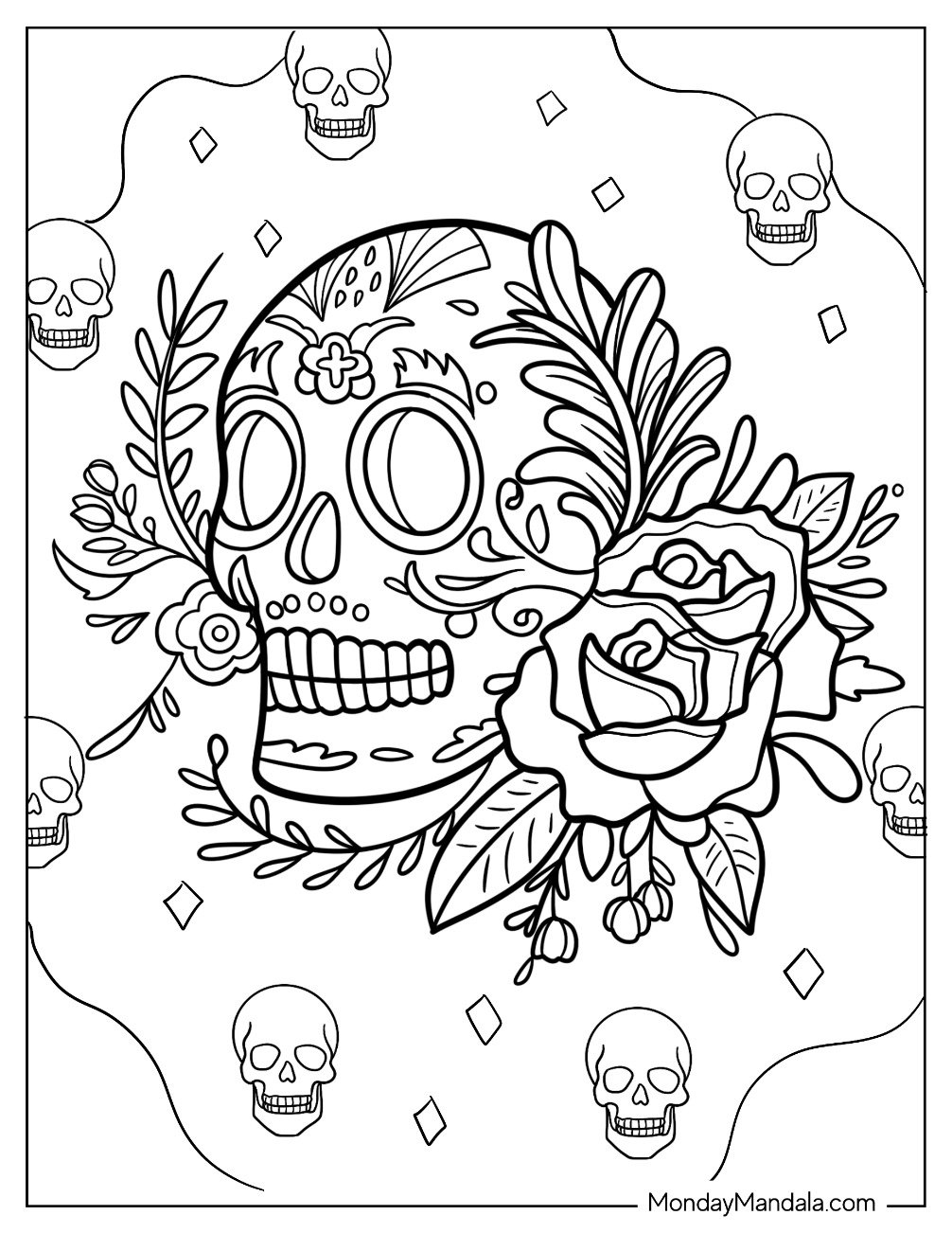 Printable Day Of The Dead Skull Black And White Coloring Sheet Outline Sketch Drawing Vector Skull Drawing Wing Drawing Ring Drawing PNG And Vector With Transparent Background For Free Download