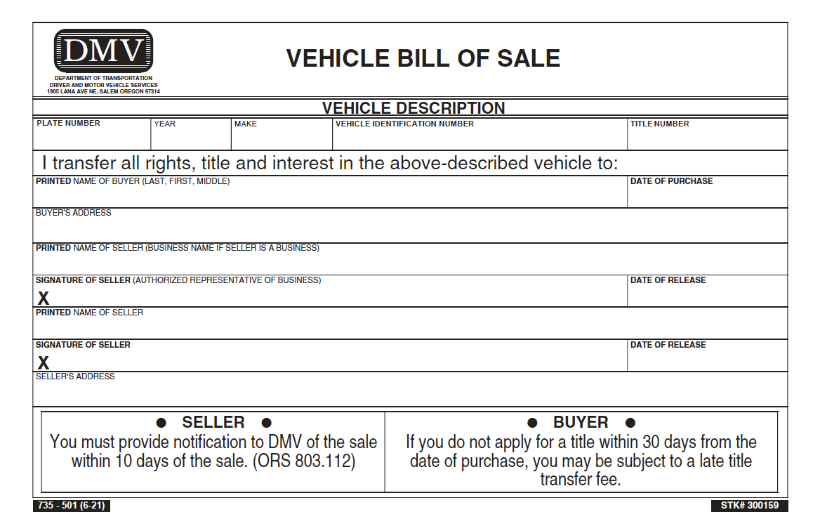 Free Oregon Motor Vehicle Bill Of Sale Form PDF
