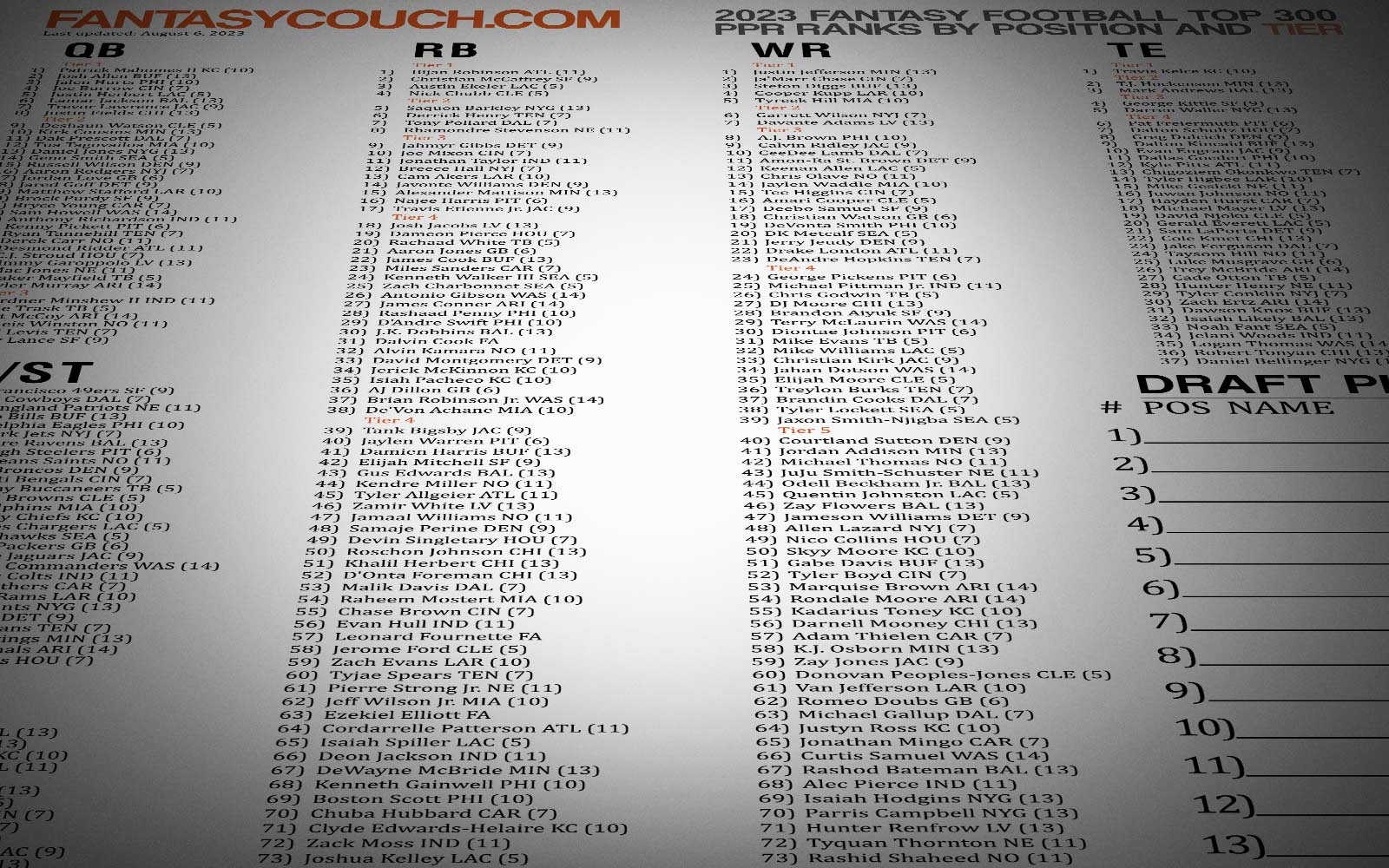 Top 300 List Fantasy Football 2023 CHEAT SHEET