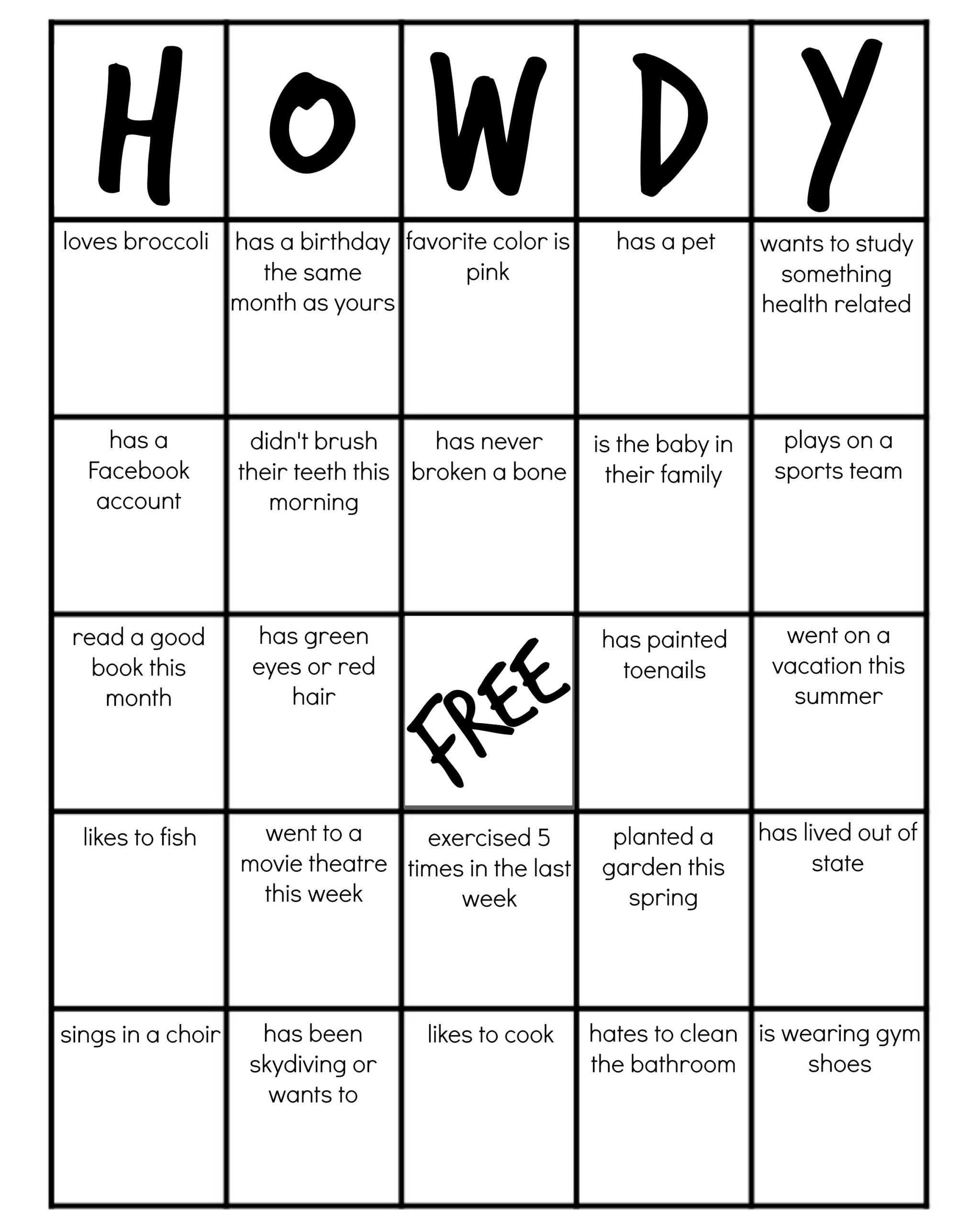 Players can mark off squares on their bingo cards as they learn more about each other, racing to be the first to get five in a row and shout “Bingo!” The game is suitable for all ages and can be customized to suit the interests and preferences of your group.