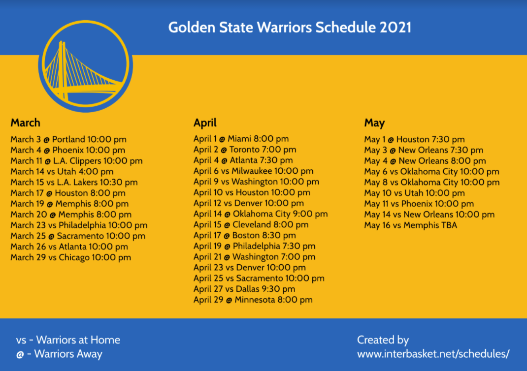 Printable Golden State Warriors Schedule TV Schedule For 2020 21 Season Updated March Interbasket