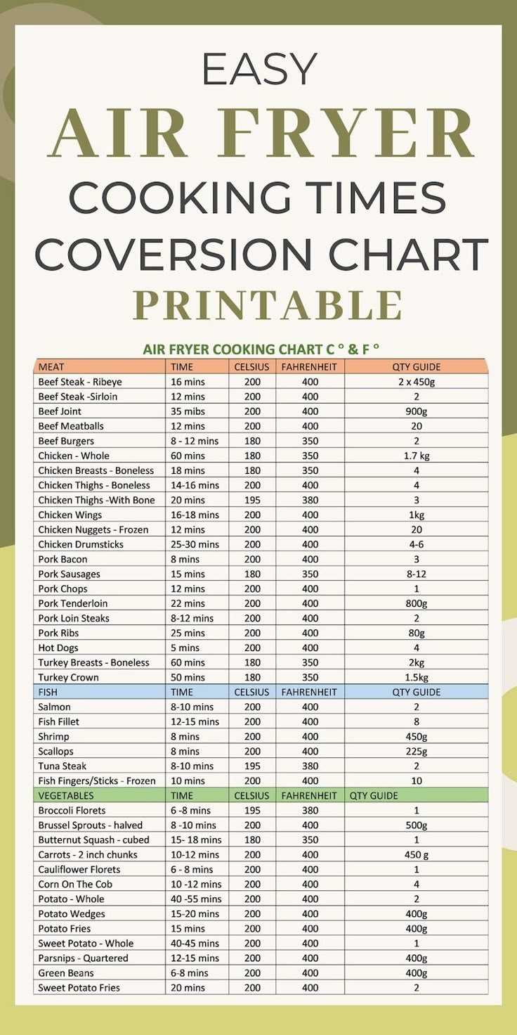 Air Fryer Cooking Time Conversion Chart Printable Air Fryer Cheat Sheet Air Fryer Quick Reference Guide Downloadable PDF Etsy