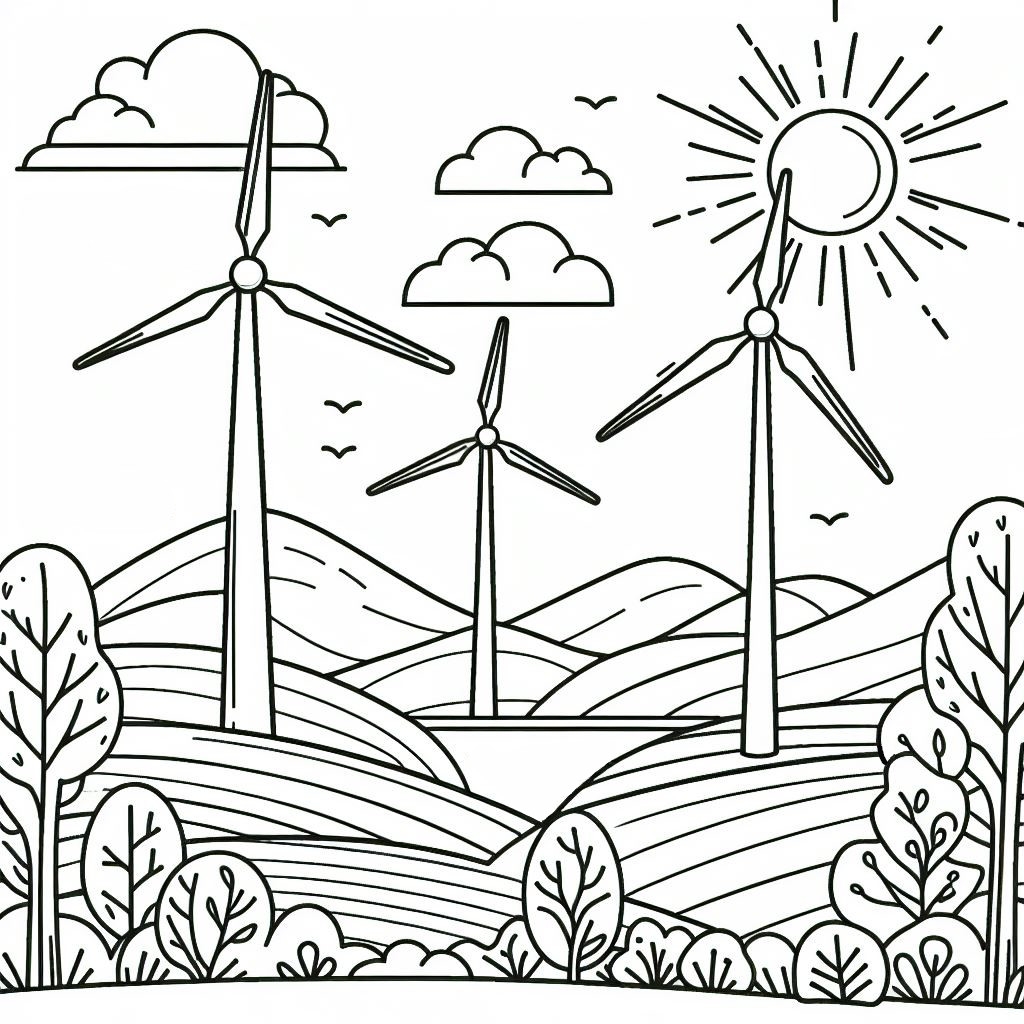 Landscape With Wind Turbines And Sun Coloring Page
