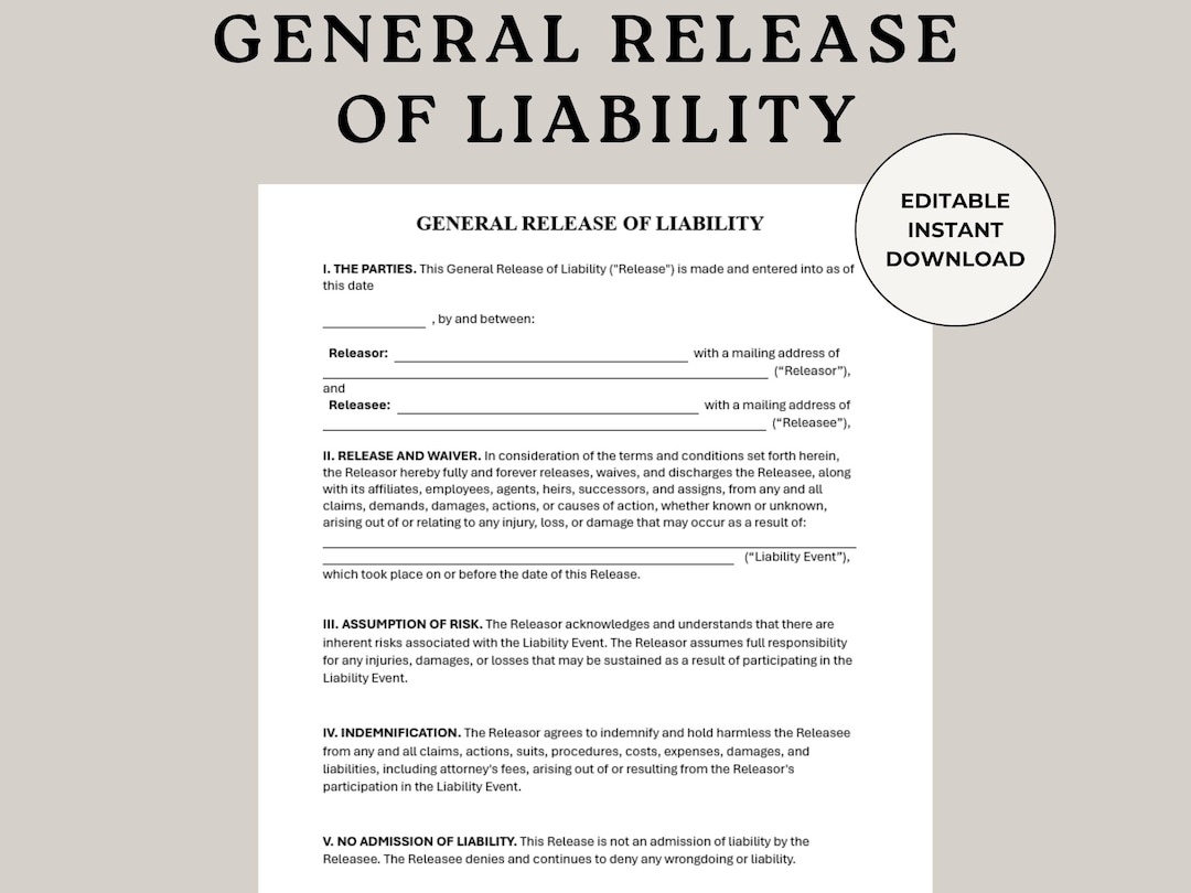 General Release Of Liability General Liability Hold Harmless Informed Consent Indemnity Waiver Liability Form Damage Waiver Form Etsy