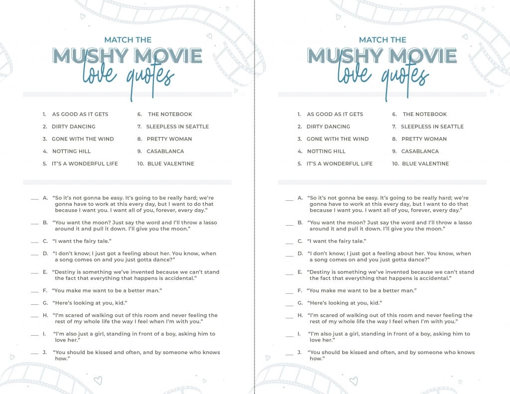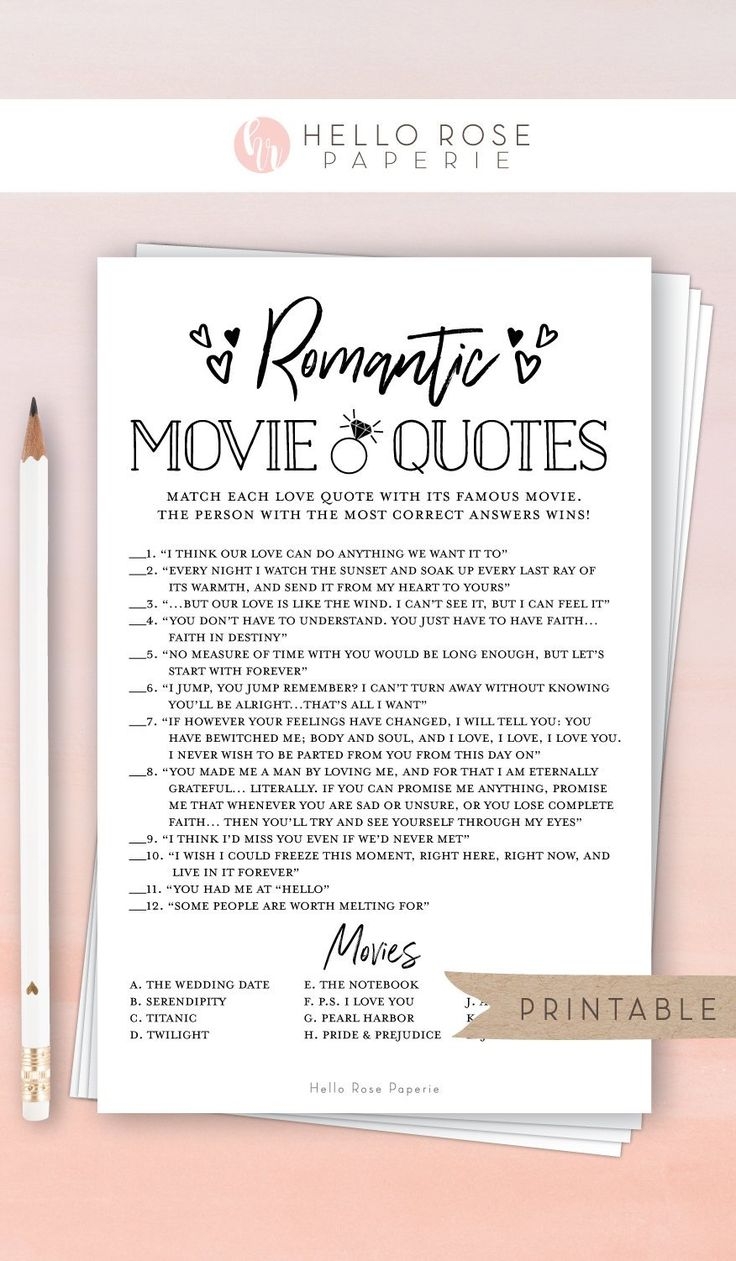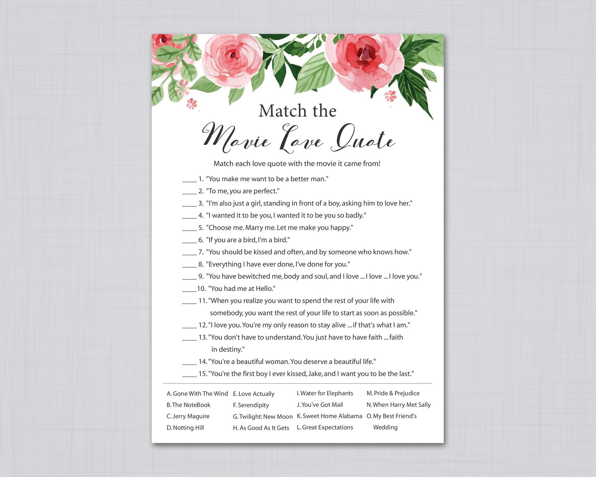 Printable Bridal Shower Game Match The Mushy Movie Love Quotes Totally Inspired