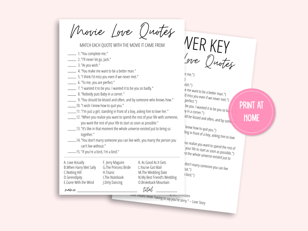 Are you a movie buff who loves a good romantic quote? Look no further! We have the perfect game for your next get-together with friends or date night in. Our Printable Movie Love Quotes Game is sure to bring some love and laughter to your evening.
