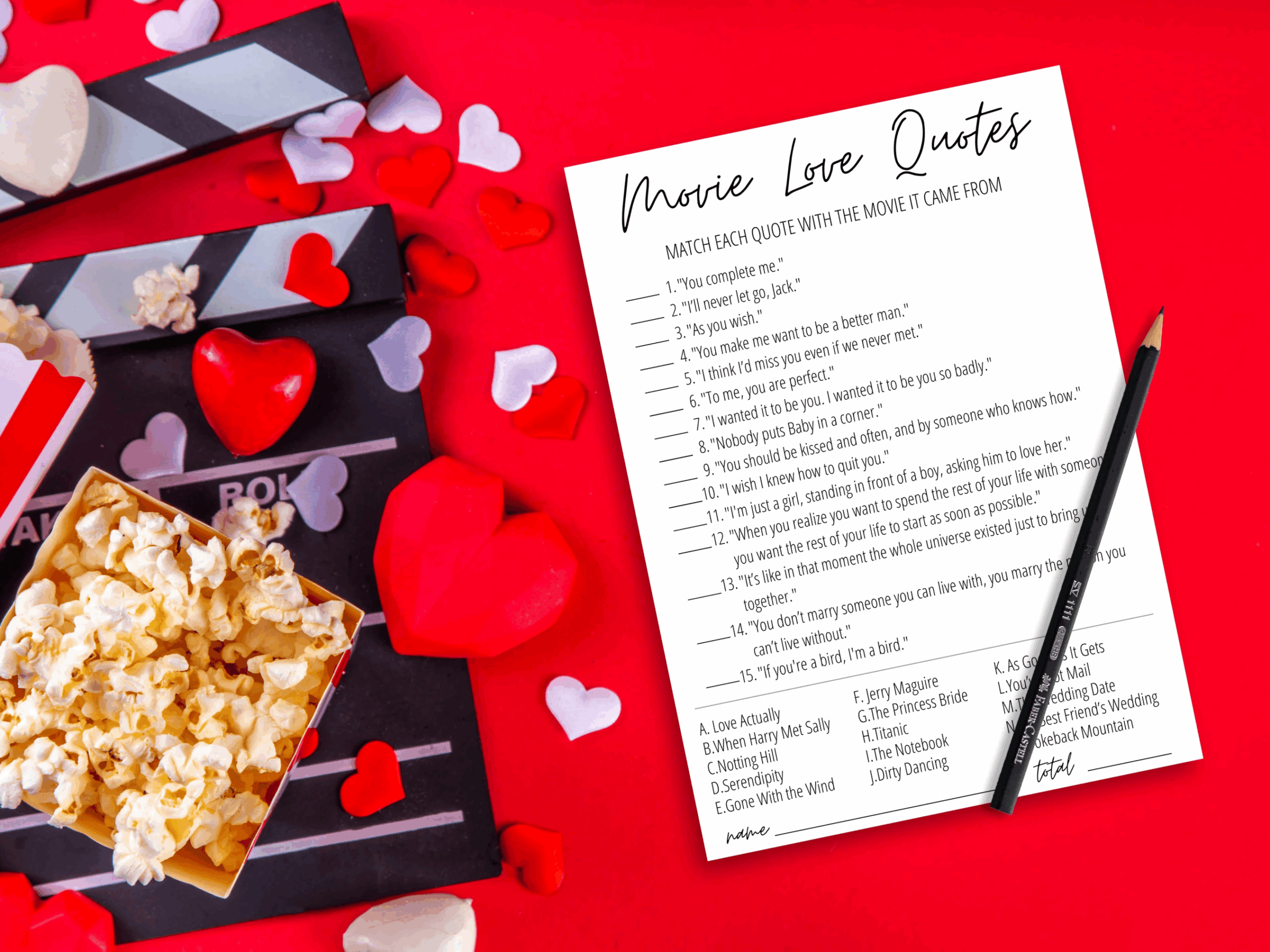 With this game, you can test your knowledge of famous romantic movie lines and see who can guess the movie they’re from. It’s a fun and interactive way to enjoy some of the most iconic love quotes from the big screen. Simply print out the game cards, grab some popcorn, and get ready for a night of movie magic!