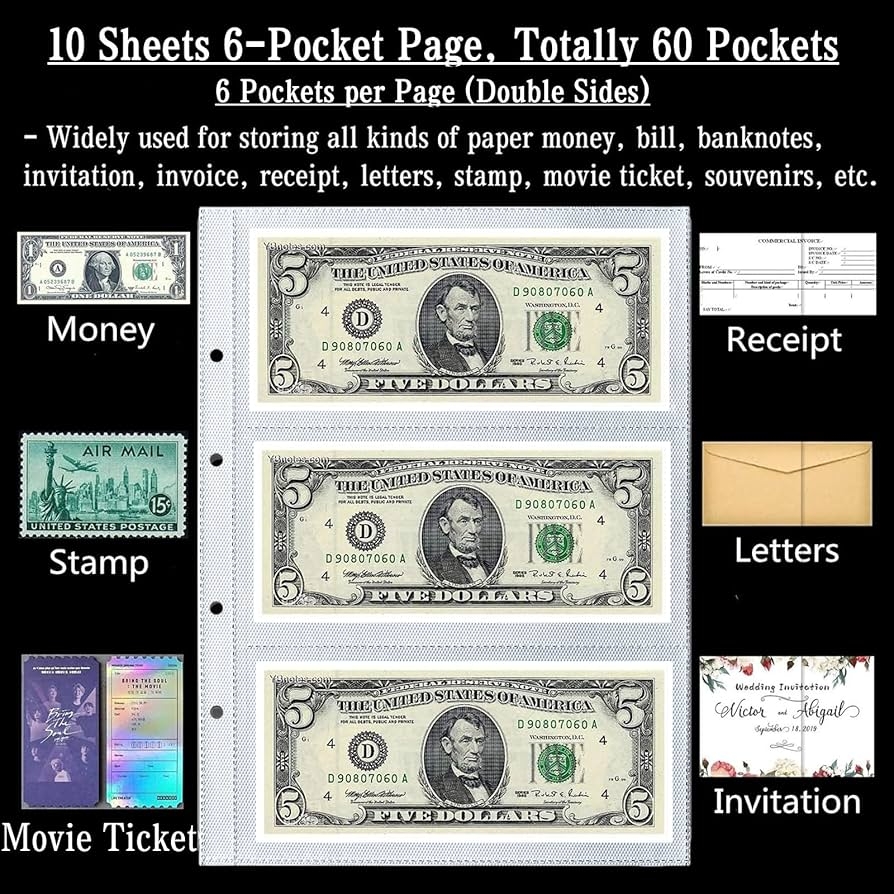 Ettonsun 10 Sheets 60 Pockets Paper Money Collection Pages Currency Sleeves Currency Holder Collection Supplies Album Pages For Travel Money Storage Amazon au Stationery Office Products