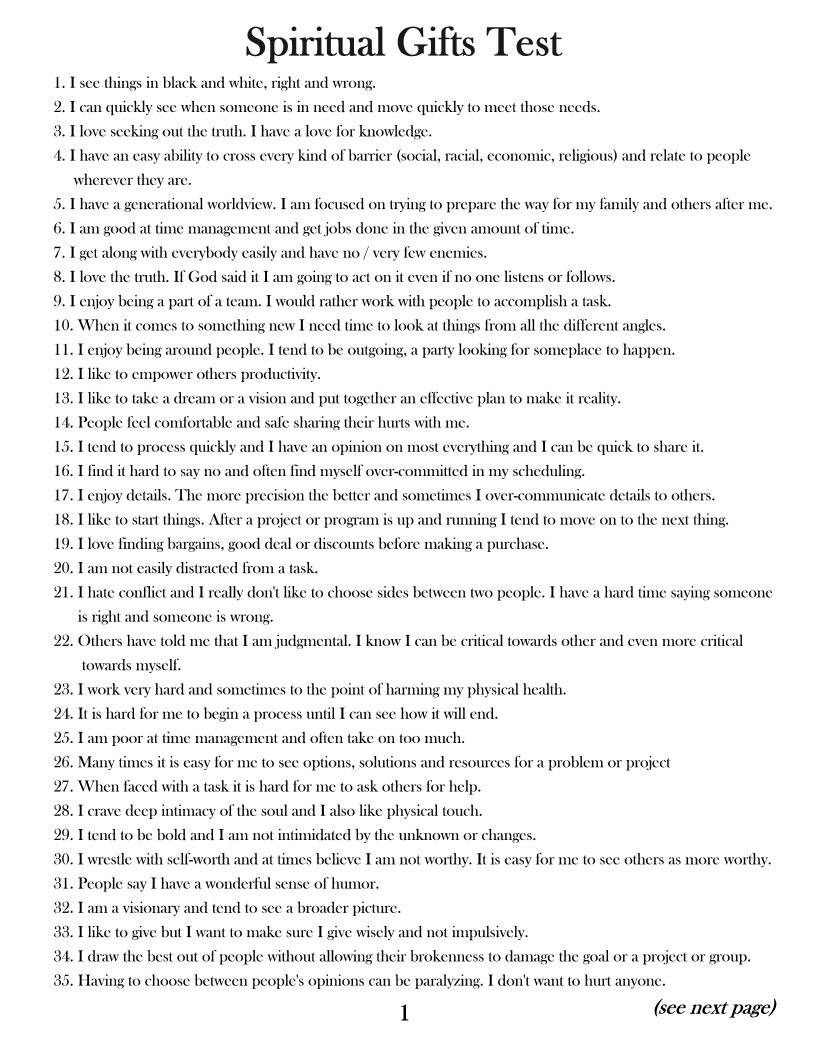 Printable Spiritual Gifts Test For Adults